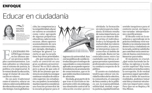 Sin duda, gran parte de lo que trae el currículo es importante y útil, sin embargo, una dimensión central de la educación escolar parece olvidada: la formación en valores para la ciudadanía. El énfasis resulta de suma importancia, ya que en un entorno donde prima el individualismo y la búsqueda de exclusividad los valores universales, al parecer, se interpretan como circunscritos al ámbito de lo privado. Basta ver las contradicciones entre las cualidades que llevan a algunas personas a posiciones profesionales reconocidas y su conducta respecto de lo público.