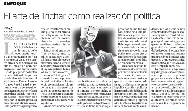 Linchar al enemigo (interpelación, censura, crítica destructiva y descalificadora) es el modo de mostrarse como diferente a ese otro; pero cuando en el espacio político todos lo hacen (linchar a otros), resulta que “distinguirse” con esta forma de proceder solo es imitarse. La violencia es contagiosa y solo importará ganar aunque el país sufra las consecuencias. Es triste que nuestro escenario político actual no haga más que recrear lo más obscuro de la política.