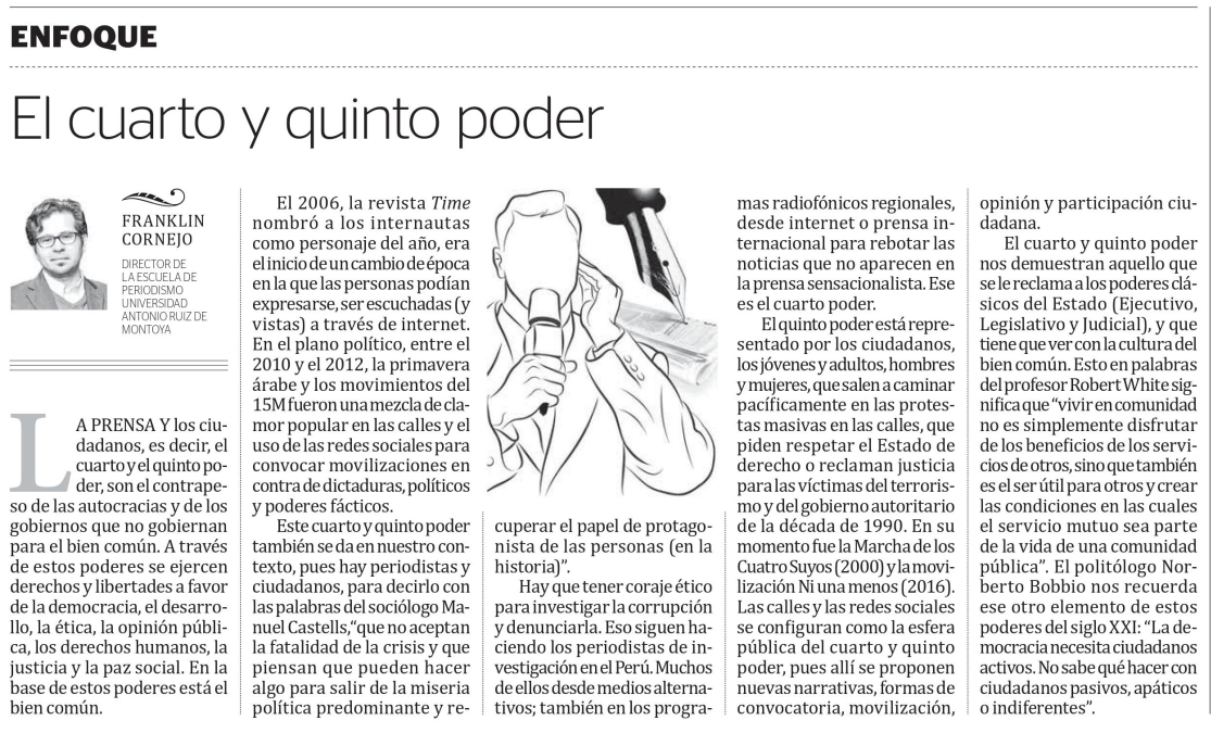Hay que tener coraje ético para investigar la corrupción y denunciarla. Eso han hecho y siguen haciendo los periodistas de investigación en el Perú. Muchos de ellos desde medios alternativos; también en los programas radiofónicos regionales, desde internet o a través la prensa internacional para rebotar las noticias que no aparecen en la prensa sensacionalista. Ese es el cuarto poder.