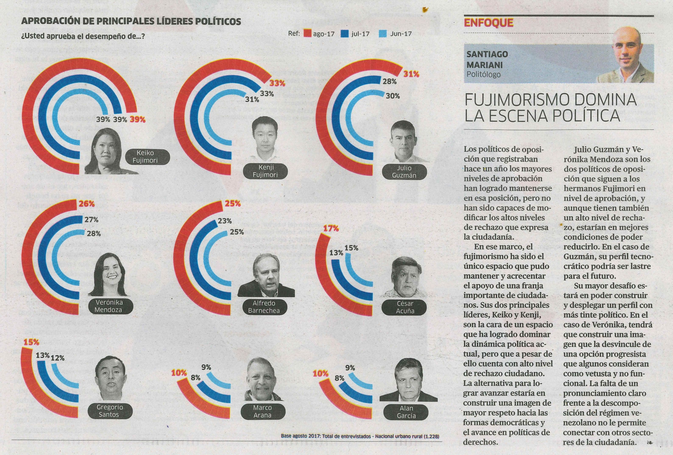 En ese marco, el fujimorismo ha sido el único espacio que pudo mantener y acrecentar el apoyo de una franja importante de ciudadanos. Sus dos principales líderes, Keiko y Kenji, son la cara de un espacio que ha logrado dominar la dinámica política actual, pero que a pesar de ello cuenta con alto nivel de rechazo ciudadano. La alternativa para lograr avanzar estaría en construir una imagen de mayor respeto hacia las formas democráticas y el avance en políticas de derechos.
