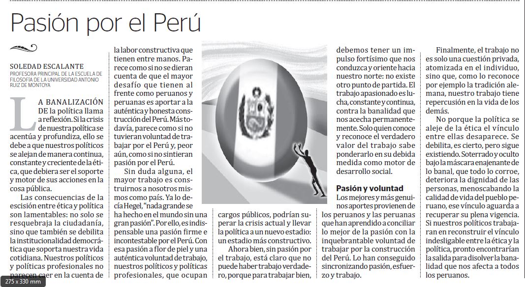 Sin duda alguna, el mayor trabajo es construirnos a nosotros mismos como país. Ya lo decía Hegel, “nada grande se ha hecho en el mundo sin una gran pasión”. Por ello, es indispensable una pasión firme e incontestable por el Perú. Con esa pasión a flor de piel y una auténtica voluntad de trabajo, nuestros políticos y políticas profesionales, que ocupan cargos públicos, podrían superar la crisis actual y llevar la política a un nuevo estadio: un estadio más constructivo.
