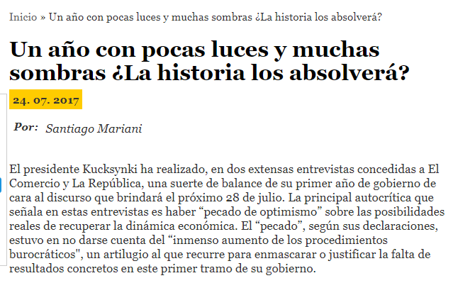 El presidente Kucksynki ha realizado, en dos extensas entrevistas concedidas a El Comercio y La República, una suerte de balance de su primer año de gobierno de cara al discurso que brindará el próximo 28 de julio. La principal autocrítica que señala en estas entrevistas es haber “pecado de optimismo” sobre las posibilidades reales de recuperar la dinámica económica. El “pecado”, según sus declaraciones, estuvo en no darse cuenta del “inmenso aumento de los procedimientos burocráticos", un artilugio al que recurre para  enmascarar o justificar la falta de resultados concretos en este primer tramo de su gobierno.