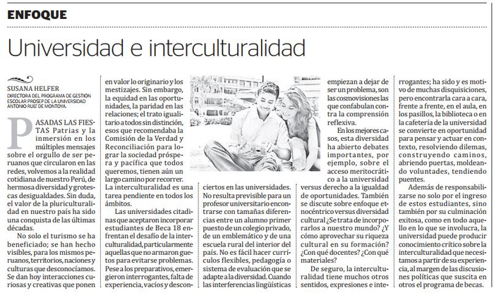 Las universidades citadinas que aceptaron incorporar estudiantes de Beca 18 enfrentan el desafío de la interculturalidad, particularmente aquellas que no armaron guetos para evitarse problemas. Pese a los preparativos, emergieron interrogantes, falta de experiencia, vacíos y desconciertos en las universidades. No resulta previsible para un profesor universitario encontrarse con tamañas diferencias entre un alumno primer puesto de un colegio privado, de un emblemático y de una escuela rural del interior del país. No es fácil hacer currículos flexibles, pedagogía o sistema de evaluación que se adapte a la diversidad. Cuando las interferencias lingüísticas empiezan a dejar de ser un problema son las cosmovisiones las que confabulan contra la comprensión reflexiva.