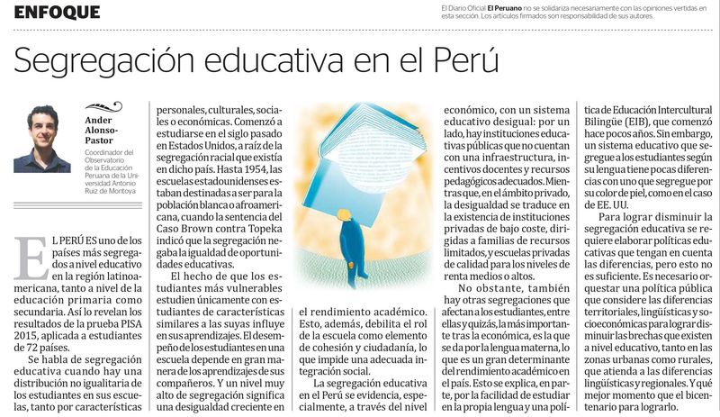 Perú es uno de los países más segregados a nivel educativo en la región latinoamericana, tanto a nivel de la educación primaria, como secundaria. Así lo revelan los resultados de la prueba PISA 2015, aplicada a estudiantes de 72 países. Se habla de segregación educativa cuando hay una distribución no igualitaria de los estudiantes en sus escuelas, tanto por características personales, culturales, sociales o económicas. Comenzó a estudiarse en el siglo pasado en los Estados Unidos, a raíz de la segregación racial que existía en dicho país. Hasta 1954, las escuelas estadounidenses estaban destinadas a ser para la población blanca o afroamericana, cuando la sentencia del Caso Brown contra Topeka indicó que la segregación negaba la igualdad de oportunidades educativas.