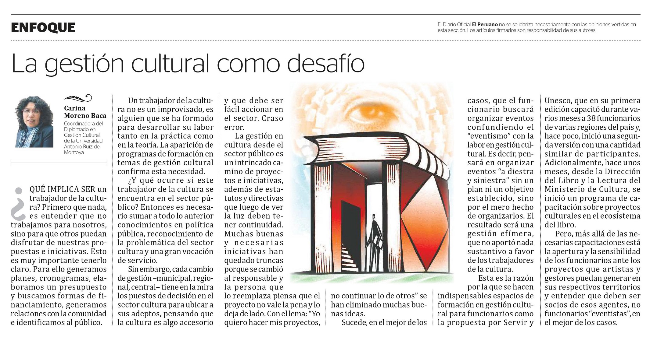 La gestión en Cultura desde el sector Público es un intricado camino de proyectos e iniciativas, además de estatutos y directivas que luego de ver la luz deben tener continuidad. Muchas buenas y necesarias iniciativas han quedado truncas porque se cambió al responsable y la persona que lo reemplaza, piensa que el proyecto no vale la pena y lo deja de lado. Bajo el lema: “Yo quiero hacer mis proyectos, no continuar lo de otros” se han eliminado muchas buenas ideas.