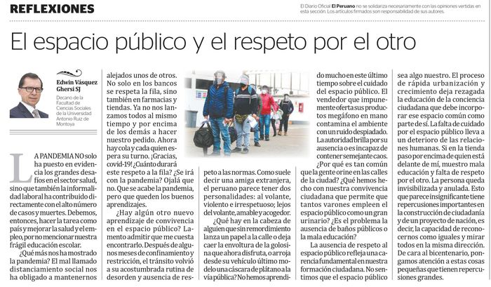 La ausencia de respeto al espacio público refleja una carencia fundamental en nuestra formación ciudadana. No sentimos que el espacio público sea algo nuestro. El proceso de rápida urbanización y crecimiento dejan rezagada la educación de la conciencia ciudadana que debe incorporar ese espacio común como parte de sí. La falta de cuidado por el espacio público lleva a un deterioro de las relaciones humanas. Si en la tienda paso por encima de quien está delante de mí, muestro mala educación y falta de respeto por el otro. La persona queda invisibilizada y anulada. Esto que parece insignificante tiene repercusiones importantes en la construcción de ciudadanía y de un proyecto de nación, es decir, la capacidad de reconocernos como iguales y mirar todos en la misma dirección. De cara al bicentenario, pongamos atención a estas cosas pequeñas que tienen repercusiones grandes.