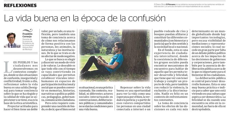 Los pueblos y los ciudadanos nos desenvolvemos en contextos complejos, donde se dan situaciones de confusión, inseguridad y conflictividad; frente a ello reflexionar sobre la vida buena es una salida (benigna) para tomar conciencia sobre lo que se ha elegido y la calidad de vida que se aspira tener o se tiene, esa es la base de la ética aristotélica.
