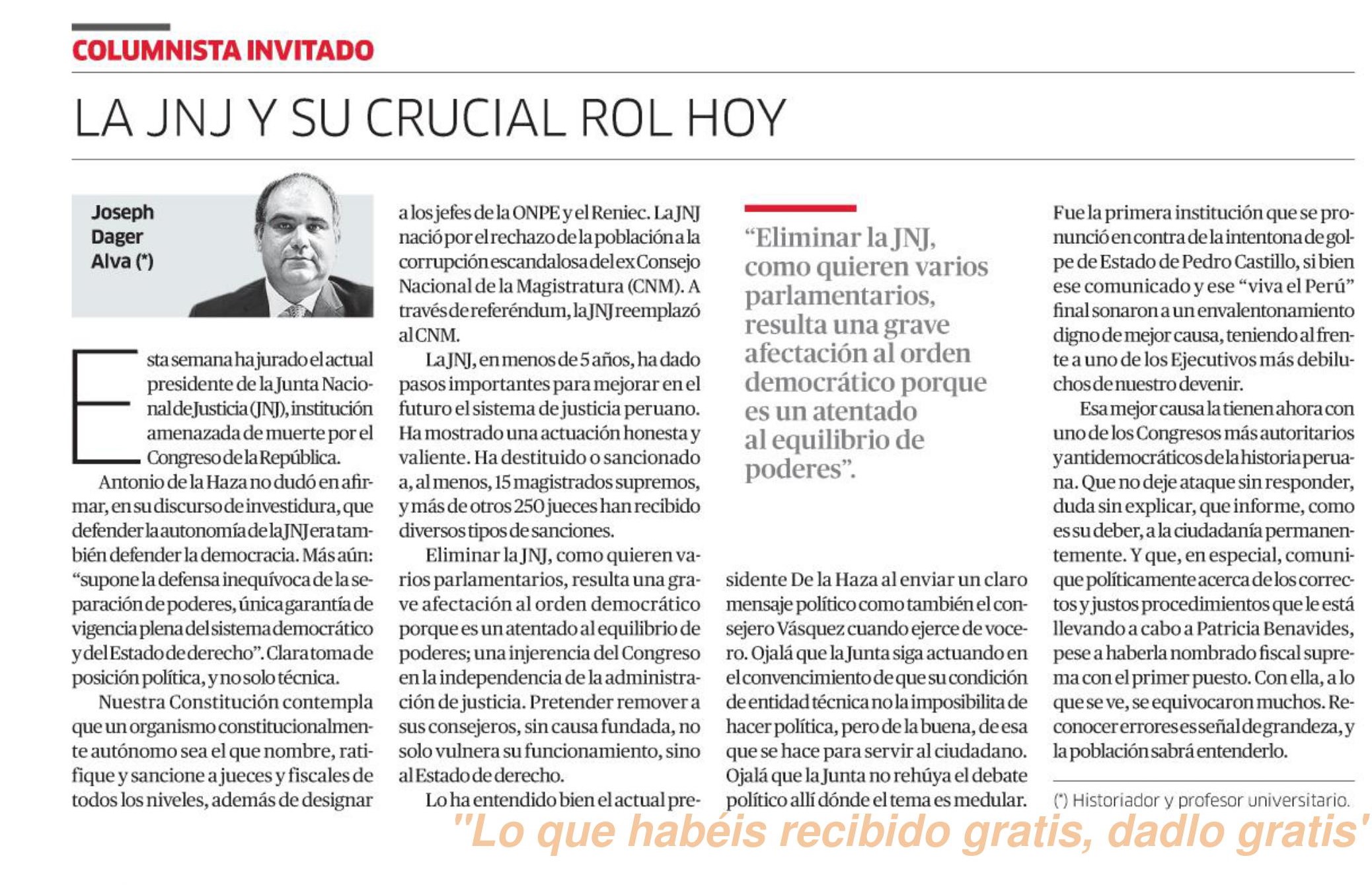 Esta semana ha jurado el actual presidente de la Junta Nacional de Justicia (JNJ), institución amenazada de muerte por el Congreso de la República.