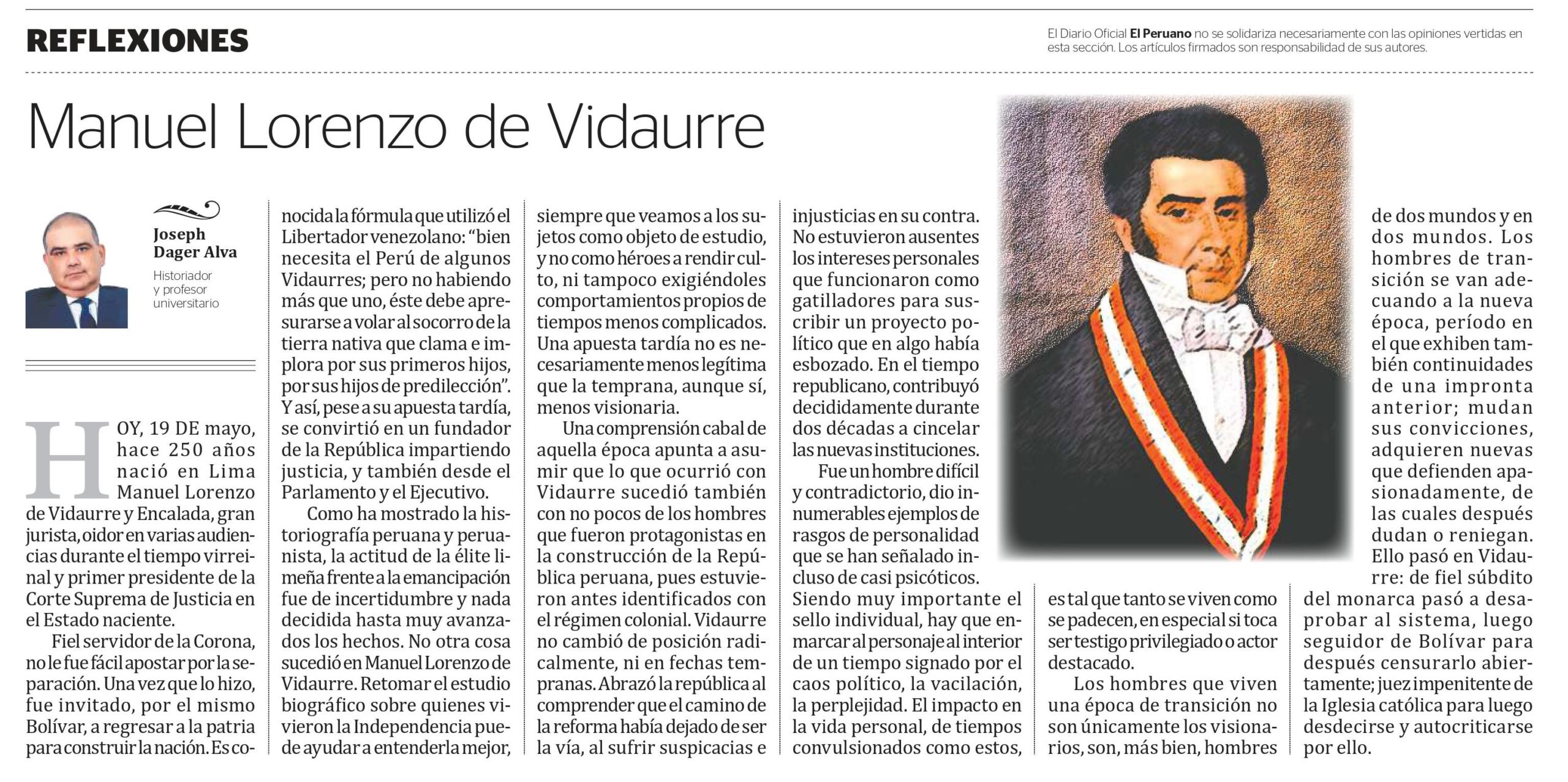 HOY, 19 DE mayo, hace 250 años nació en Lima Manuel Lorenzo de Vidaurre y Encalada, gran jurista, oidor en varias audiencias durante el tiempo virreinal y primer presidente de la Corte Suprema de Justicia en el Estado naciente.