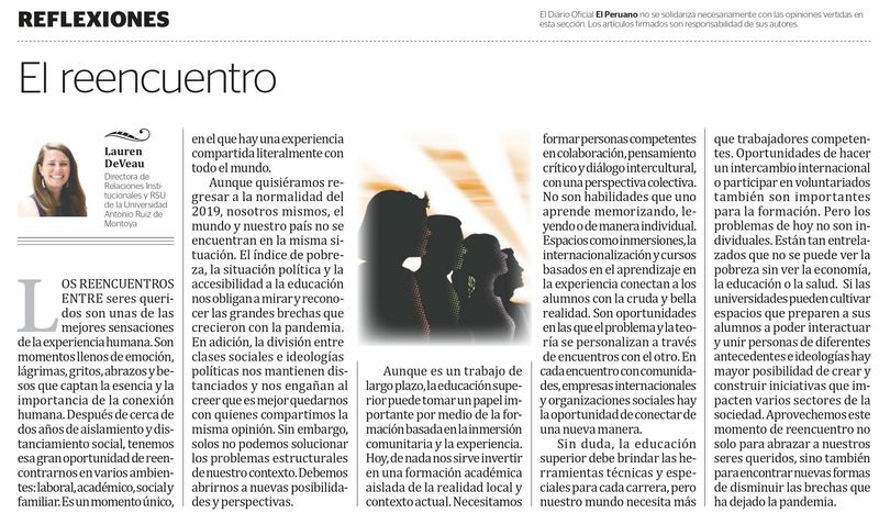 Sin duda, la educación superior debe brindar las herramientas técnicas y especiales para cada carrera, pero nuestro mundo necesita más que trabajadores competentes. Oportunidades de realizar un intercambio internacional o participar en voluntariados también son importantes para la formación. Pero los problemas de hoy, no son problemas individuales. Están tan entrelazados que no se puede ver la pobreza sin ver la economía, la educación o la salud. Si las universidades pueden cultivar espacios que preparen a sus alumnos a poder interactuar y unir personas de diferentes antecedentes e ideologías hay mayor posibilidad de crear y construir iniciativas que impacten varios sectores de la sociedad. Aprovechemos este momento de reencuentro no solo para abrazar a nuestros seres queridos sino también para encontrar nuevas formas de disminuir las brechas que ha dejado la pandemia.