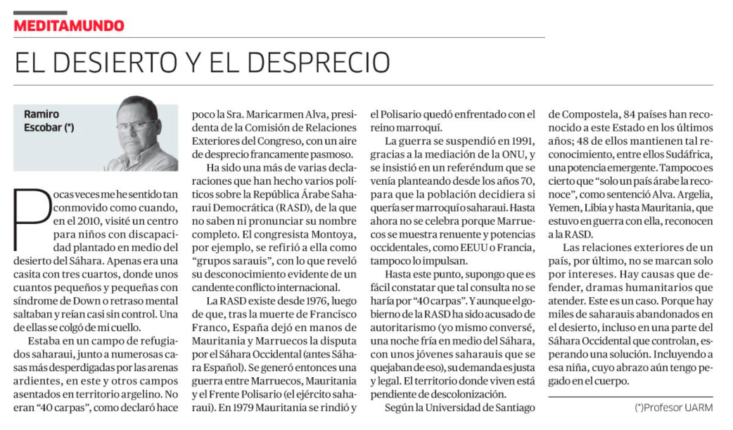 Según la Universidad de Santiago de Compostela, 84 países han reconocido a este Estado en los últimos años; 48 de ellos mantienen tal reconocimiento, entre ellos Sudáfrica, una potencia emergente. Tampoco es cierto que “solo un país árabe la reconoce”, como sentenció Alva. Argelia, Yemen, Libia y hasta Mauritania, que estuvo en guerra con ella, reconocen a la RASD.