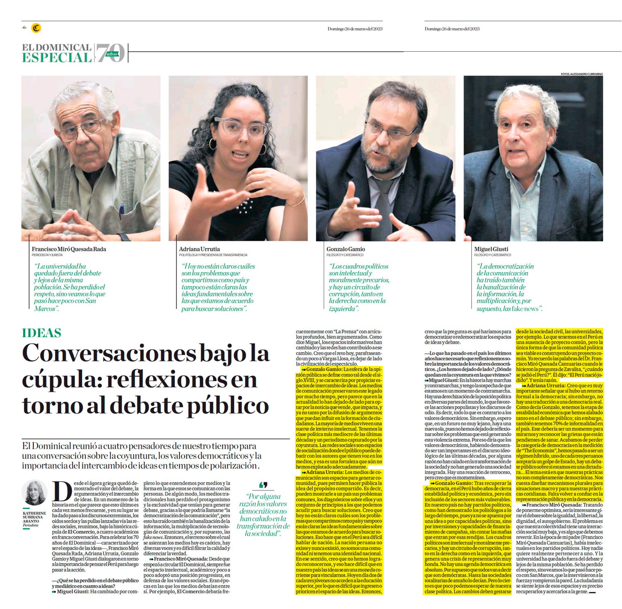 Para celebrar los 70 años de El Dominical de El Comercio, el espacio cultural más antiguo de la prensa peruana, se organizó una mesa de diálogo con renombrados intelectuales, entre los que participaron Adriana Urrutia, docente de la carrera de Ciencia Política y Gonzalo Gamio, docente de la carrera de Filosofía de la Universidad Antonio Ruiz de Montoya (UARM), junto a Francisco Miró Quesada Rada y Miguel Giusti. Se reunieron para conversar sobre la coyuntura, los valores democráticos y la importancia del intercambio de ideas en tiempos de polarización.