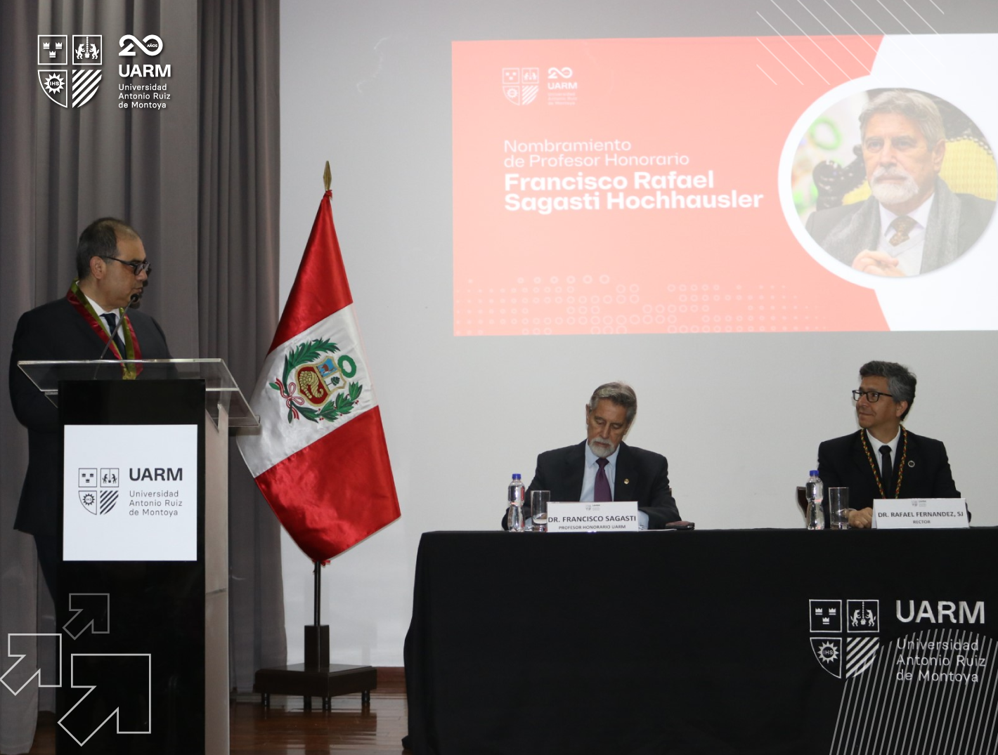 El Dr. Rafael Fernández Hart SJ, rector, brindó una alocución y procedió con la imposición de la medalla. “Esta noche comienzo por expresar mi gratitud al Dr. Francisco Sagasti por toda su trayectoria que evidencia que es posible, no sin esfuerzo y empeño, encarnar valores hoy tan venidos a menos como la honestidad, la justicia, la transparencia, y, sobre todo, el juicio”, expresó. Recordó que el filósofo Kant resumió la ética de la consistencia, de la compasión o de la empatía de la siguiente manera: “obra de tal modo que te relaciones con la humanidad tanto en tu persona como en la de cualquier otro, siempre como un fin y nunca solo como un medio”. En ese sentido, la UARM se precia en hacer un reconocimiento a una persona que con disciplina personal y amor a su país se propuso mirar a los demás como fines y no como objetos.