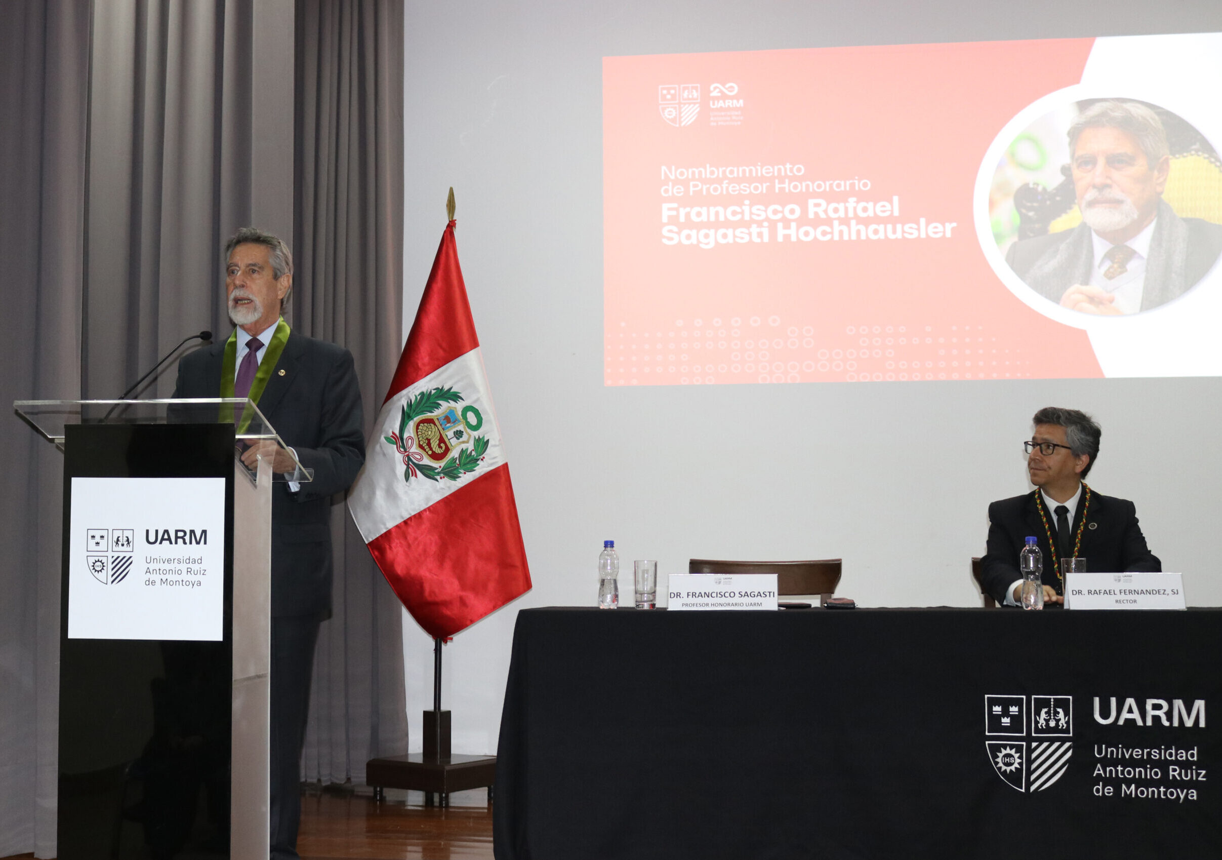 En su lectio como profesor honorario, el Dr. Francisco Sagasti destacó tres valores que ha promovido la Compañía de Jesús, los cuales tienen que ver con el compromiso irrenunciable con la dignidad de todo ser humano, la toma de conciencia y la internalización del sentido de responsabilidad, y la vocación de servicio. Hizo un llamado a poner énfasis, desde el quehacer universitario, en la primera infancia, ya que el cuidado entre los 0 y 3 años es fundamental en el desarrollo emocional y condicionan las características personales a lo largo de toda la vida. Además, hizo hincapié en la importancia de valorar la diversidad del Perú y enseñar a los jóvenes una lectura crítica de la abundante información existente en el internet y redes sociales, que podría llegar a abrumarlos.