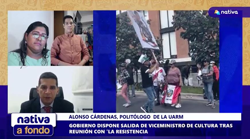 Alonso Cárdenas, docente de la carrera de Ciencia Política de la Universidad Antonio Ruiz de Montoya (UARM), participó en una entrevista vía Nativa TV sobre la remoción del viceministro de Interculturalidad tras reunirse con La Resistencia. “Ha sido un error garrafal dado que los antecedentes de este grupo hablan por sí solos. En febrero, la Asociación Judía del Perú emitió un comunicado en el que hicieron referencia a las agresiones al periodista Gustavo Gorriti y acusaron a La Resistencia de antisemitismo. Con estos antecedentes públicos es un error recibirlos en el Ministerio de Cultura, sobre todo, con el viceministerio de Interculturalidad, el cual es el abanderado en el Ejecutivo en cuanto a la lucha contra la discriminación”, expresó.