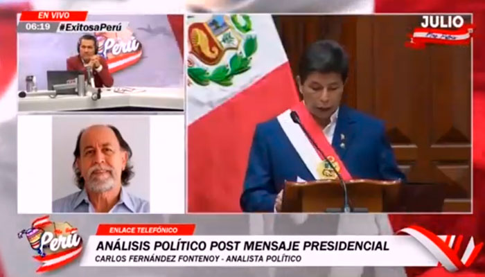 Carlos Fernández Fontenoy, coordinador de la Maestría en Ciencia Política de la Universidad Antonio Ruiz de Montoya (UARM), participó en una entrevista para Exitosa TV, en la cual analizó el mensaje a la Nación que el presidente Pedro Castillo brindó el pasado 28 de julio por Fiestas Patrias. Consideró que el mensaje presidencial fue “un poco más de lo mismo” y que “no se escucharon anuncios nuevos respecto varios temas fundamentales” para el país, como la seguridad, la salud y la lucha anticorrupción.