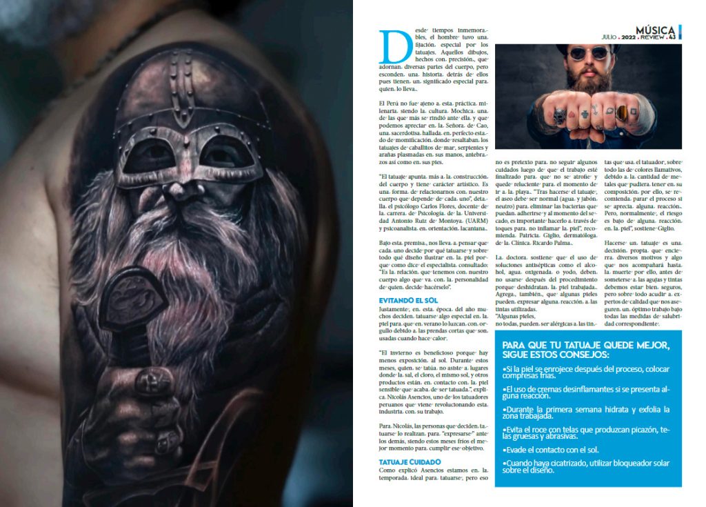 ¿Qué motiva a una persona a lucir una imagen tatuada en su piel? La Revista Review preparó un informe en donde se abordó porque esta práctica milenaria se mantiene más que vigente hasta nuestros días. Al respecto Carlos Flores Galindo, docente de la carrera de Psicología de la Universidad Antonio Ruiz de Montoya (UARM) señaló que los tatuajes encierran una conexión estrecha con la forma con la que nos relacionamos con nuestro propio cuerpo. Una decisión muy personal que guarda siempre una historia.