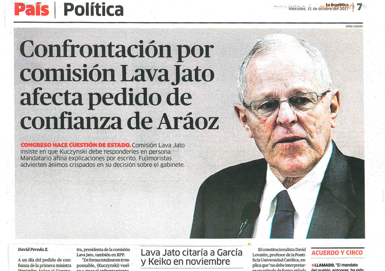 La comisión Lava Jato hace unos días envió un segundo oficio al presidente Kuczynski insistiendo en su pedido para que responda en persona ante la comisión Lava Jato sobre su participación en el proceso de concesión de la Carretera Interoceánica. Esto enrarece la relación entre el Ejecutivo y el Legislativo. A un día del pedido de confianza de la primera ministra Mercedes Aráoz al Congreso, el politólogo Alonso Cárdenas, docente de la Escuela de Ciencia Política de la Ruiz, fue entrevistado por La República para analizar cómo queda su esfuerzo por ganarse el favor de las bancadas en su ronda de reuniones.