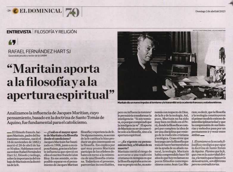 El P. Rafael Fernández Hart SJ, rector de la Universidad Antonio Ruiz de Montoya (UARM), participó en una entrevista para El Dominical de El Comercio acerca de la influencia en el catolicismo de Jacques Maritan, filósofo francés, cuyo pensamiento estuvo basado en la doctrina de Santo Tomás de Aquino.