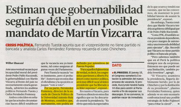 Carlos Fernández Fontenoy, director de la Escuela de Ciencia Política de la Universidad Antonio Ruiz de Montoya, participó en una entrevista para La República en la que comentó que si la vacancia por incapacidad moral del presidente Pedro Pablo Kuczynski, va o no va, no se conocerá, probablemente, hasta el último minuto. Y ello, dependerá en gran medida de la posición que adopten los diferentísimos congresistas que agrupa la bancada de Keiko Fujimori.