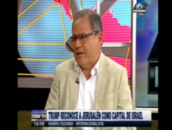 Ramiro Escobar, docente de Relaciones Internacionales de la Escuela de Periodismo de la Universidad Antonio Ruiz de Montoya, se pronunció sobre la decisión del presidente estadounidense Donald Trump de reconocer a Jerusalén como capital de Israel. “Es una decisión muy riesgosa, muy imprudente. El conflicto israelí-palestino hace tiempo estaba con un proceso de paz descarrilado, prácticamente inexistente. Esto sepulta toda posibilidad de resolver el conflicto. Tiene implicancias muy graves”, afirmó en una entrevista vía ATV+.