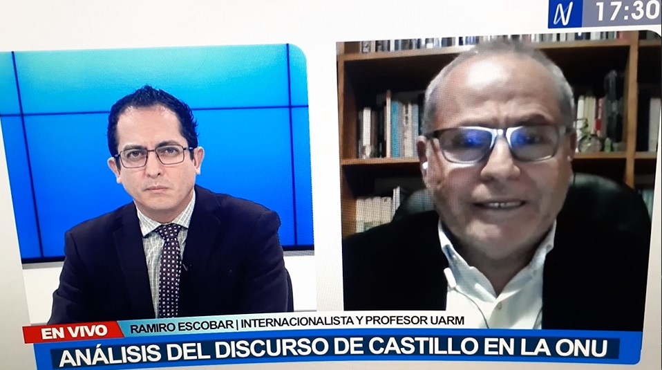 Ramiro Escobar, docente de la carrera de Ciencia Política de la Universidad Antonio Ruiz de Montoya (UARM), comentó en una entrevista en Canal N la importancia de la participación del presidente Pedro Castillo en la 76 Asamblea General de la Organización de las Naciones Unidas (ONU). “Es un evento clave para todo nuevo presidente, ya que le permite expresar las grandes políticas de gobierno y presentarse ante el mundo. Esto de cierto modo le significa adquirir un compromiso ante la comunidad internacional”, explicó.