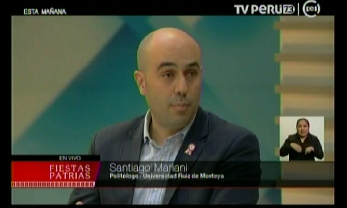 Santiago Mariani, coordinador de la Maestría en Ciencia Política de la Universidad Antonio Ruiz de Montoya, participó en TV Perú en un panel de análisis sobre el mensaje a la nación del presidente Pedro Pablo Kuczynski. Para el analista, el presidente persiste en presentar un diagnóstico errado sobre la situación que atraviesa el país. En el discurso, el presidente mencionó a la burocracia estatal como la principal traba. Mariani señaló que el marco ideológico del Gobierno es la verdadera y principal traba que impide avanzar al país. Un claro indicador de esta suerte de corset ideológico es la confianza depositada en la coyuntura internacional y la demanda de materias primas como medio para retomar el dinamismo económico. Esa es la propuesta central del gobierno sin considerar la importancia de utilizar políticas anticíclicas o de continuar y profundizar con la diversificación productiva.