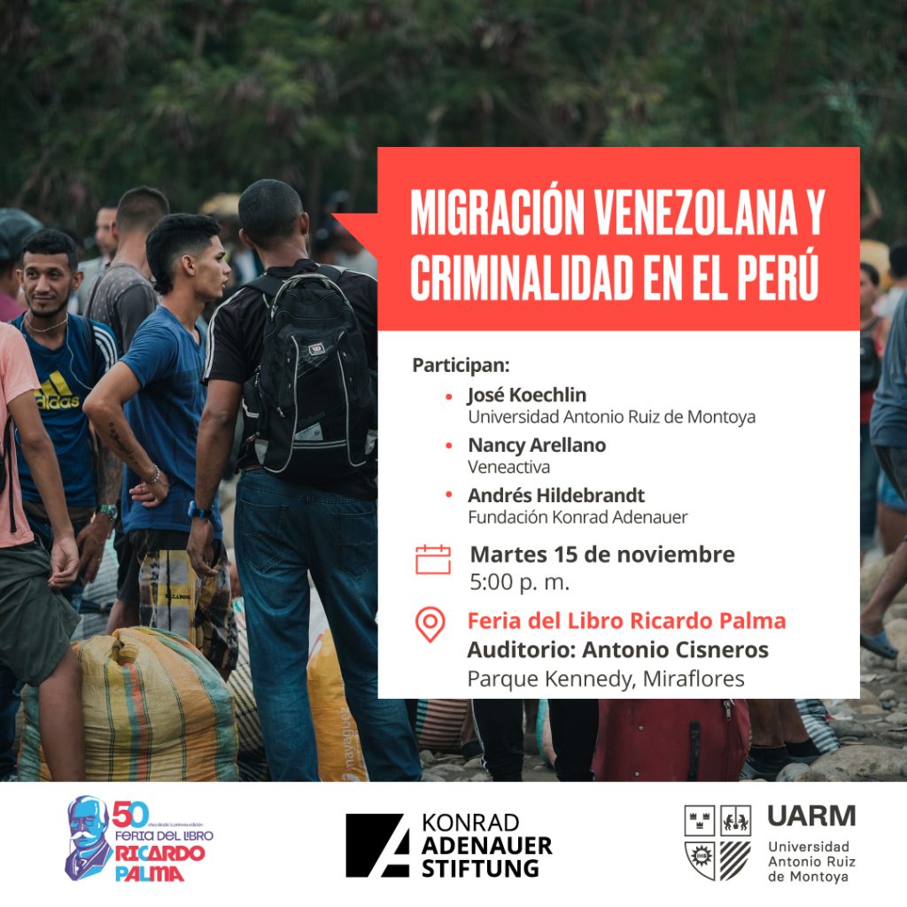 La Universidad Antonio Ruiz de Montoya (UARM), en alianza con la Fundación Konrad Adenauer Stiftung KAS Perú, invitan a participar de la mesa de diálogo “Migración venezolana y criminalidad en el Perú”, que se llevará a cabo en la Feria del Libro Ricardo Palma. El evento, a realizarse este martes 15 de noviembre a las 5 de la tarde en el Auditorio Antonio Cisneros – Parque Kennedy, Miraflores, contará con la participación de José Koechlin, coordinador académico del Instituto de Ética y Desarrollo de la UARM; Nancy Arellano, presidenta fundadora de la organización sin fines de lucro: Veneactiva y Andrés Hildebrandt de KAS Perú.