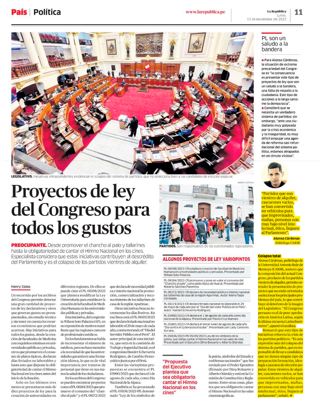 Alonso Cárdenas, docente de la carrera de Ciencia Política y coordinador de la Maestría en Ciencia Política de la Universidad Antonio Ruiz de Montoya (UARM), participó en un informe del diario La República acerca de los proyectos de ley del Congreso. Sostuvo que la composición del actual Congreso, producto de los partidos vientres de alquiler, permite entender la presentación de proyectos que no están orientados a solucionar los principales problemas del país, lo que contribuye al deterioro de la imagen del Legislativo. “El Congreso peruano es el de peor aprobación en América Latina, según la última encuesta Latinobarómetro”, señaló.