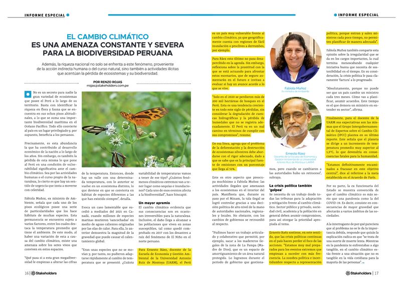 Ernesto Ráez Luna, docente de la Escuela de Economía y Gestión Ambiental de la Universidad Antonio Ruiz de Montoya, participó en un informe de la Revista Stakeholders sobre el Cambio Climático y sus consecuencias en la biodiversidad peruana.  Para el especialista el Perú es un país muy vulnerable frente al cambio climático debido a que geográficamente cuenta con regiones de fácil inundación y proclives a derrumbes.