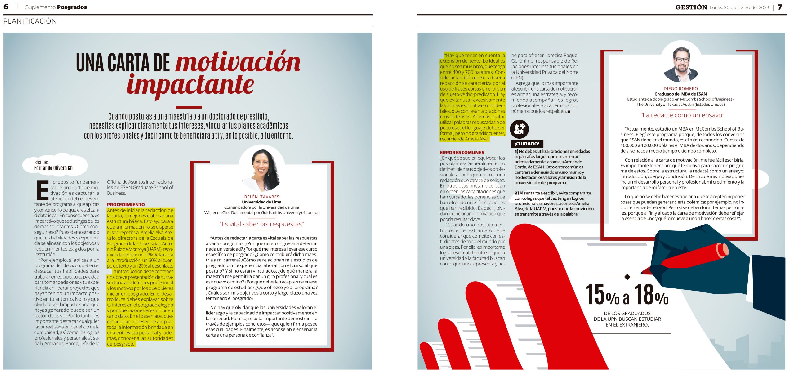 Amelia Alva Arevalo, directora de la Escuela de Posgrado de la Universidad Antonio Ruiz de Montoya (UARM), participó en un informe del suplemento Posgrados de Gestión sobre la importancia de la carta de motivación y compartió recomendaciones para su redacción. Recomendó que antes de iniciar la redacción, lo mejor es elaborar una estructura básica. Dedicar un 20% de la carta a la introducción, un 60% al cuerpo de texto y un 20% al desenlace. La introducción debe contener una breve presentación de tu trayectoria académica y profesional y los motivos por los que quieres iniciar un posgrado. En el desarrollo, te debes explayar sobre tu interés en el posgrado elegido y por qué razones eres un buen candidato. En el desenlace, puedes indicar tu deseo de ampliar toda la información brindada en una entrevista personal y, además, conocer a las autoridades del posgrado.