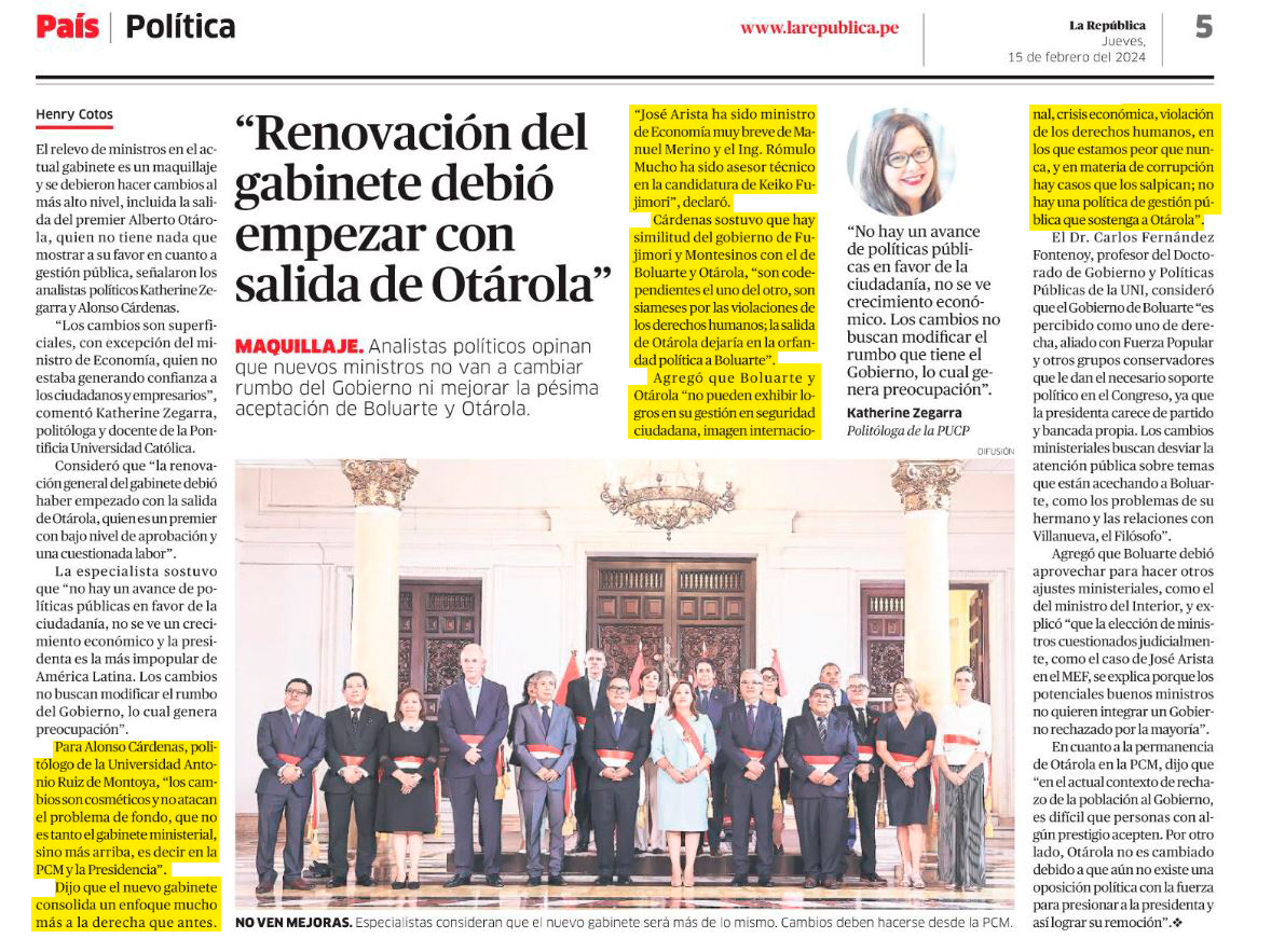 Alonso Cárdenas, coordinador de la Maestría en Ciencia Política con mención en gerencia pública de la Universidad Antonio Ruiz de Montoya (UARM), participó en un informe del diario La República acerca de los reciente cambios en el gabinete Otárola. Para el politólogo los cambios son cosméticos y no atacan el problema de fondo, que no es tanto el gabinete ministerial, sino más arriba, es decir en la PCM y la Presidencia.