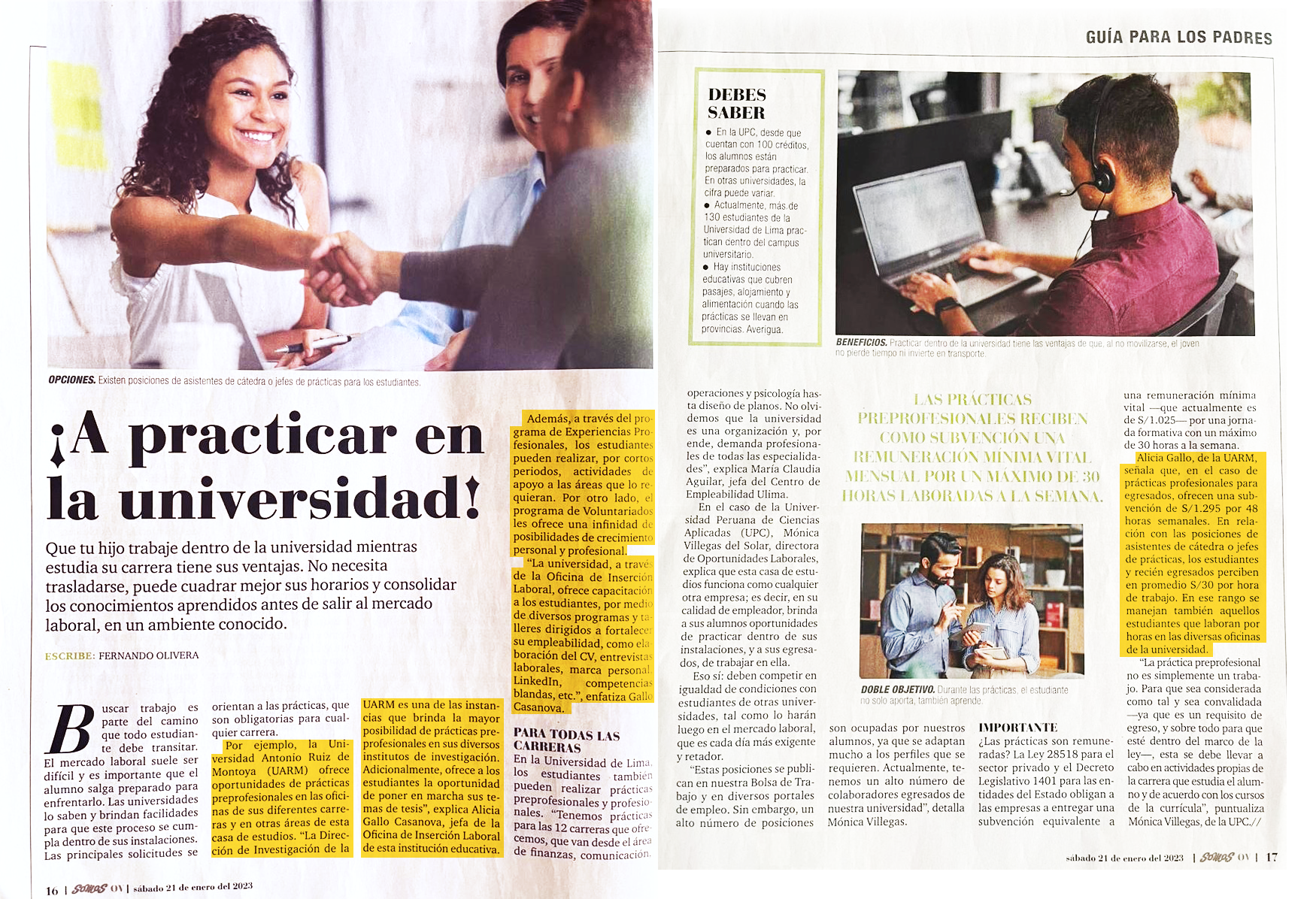 Alicia Gallo Casanova, jefa de la Oficina de Inserción Laboral de la Universidad Antonio Ruiz de Montoya (UARM), participó en un informe de la Revista Somos – Orientación Vocacional sobre las oportunidades de prácticas preprofesionales a las que pueden acceder los jóvenes que estudian en la UARM en las oficinas de las diferentes carreras y en otras áreas de esta casa de estudios.