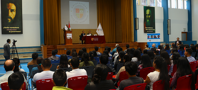 La ceremonia de bienvenida a los jóvenes ingresantes del Programa Beca 18 del Ministerio de Educación (Minedu) fue presidida por el rector de la Universidad Antonio Ruiz de Montoya, el P. Ernesto Cavassa, SJ, quien compartió con ellos los grandes retos de la vida universitaria y, sobre todo, el objetivo colectivo que en adelante los unirá a la institución: Transformar el país y ser agentes de cambio. “Entre ustedes y nosotros, vamos a ir poco a poco haciendo de este un país justo, integrado, un país digno, sin corrupción y capaz de incorporar inclusivamente a personas que tienen mayores dificultades”, expresó.