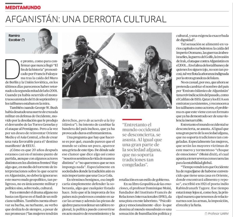 Entretanto el mundo occidental se desconcierta, se asusta. Al igual que una gran parte de la sociedad afgana, que no soporta tradiciones tan congeladas. Especialmente las mujeres, que serán las mayores víctimas de este nuevo y tormentoso “choque de emociones” (Moisi dixit), el cual apunta a tener severas consecuencias para la estabilidad global.