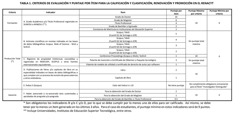 1. Se establecen siete niveles en base a los puntajes obtenidos. A estos se ha agregado un nuevo nivel de clasificación denominado "investigador distinguido" que requiere un puntaje de 200 a más.