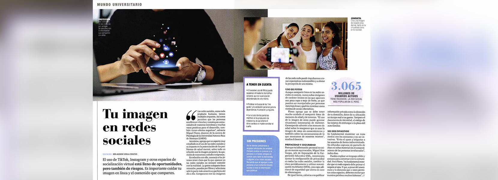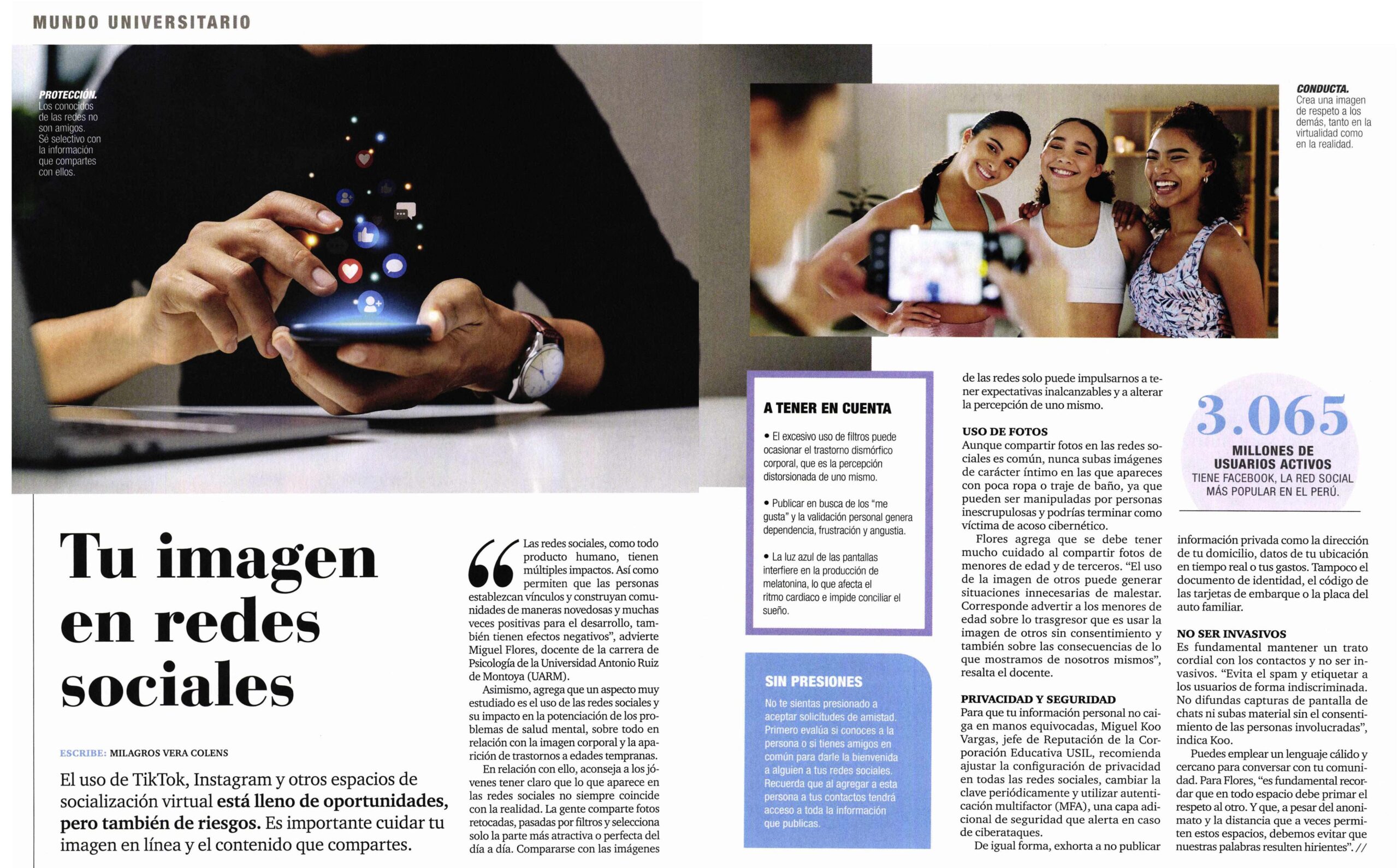 Miguel Flores Galindo, docente de la carrera de Psicología de la Universidad Antonio Ruiz de Montoya (UARM), participó en un informe de la Revista Somos Orientación Vocacional de El Comercio, en el cual brindó recomendaciones para cuidar la imagen y el contenido que los jóvenes comparten en las redes sociales.