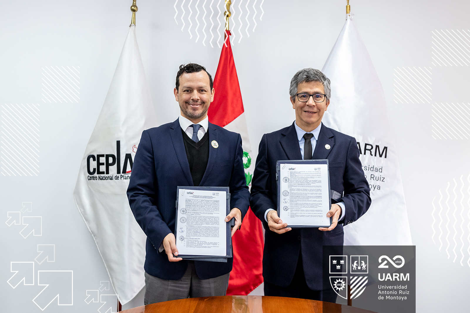 La Universidad Antonio Ruiz de Montoya (UARM) firmó un convenio marco de cooperación con el Centro Nacional de Planeamiento Estratégico (CEPLAN) con el fin de promover acciones conjuntas relacionadas con el planeamiento estratégico, programas de capacitación, investigación, organización de eventos e incidencia. La ceremonia de firma protocolar, realizada el 14 de setiembre en la sede del CEPLAN, contó con la participación de Giofianni Peirano Torriani, presidente de ese organismo y el P. Rafael Fernández Hart SJ, rector de la UARM. En representación de CEPLAN también participó Reynaldo Aponte Fretel, consultor en Planeamiento y Convenios, y por parte de la UARM, asistieron también Francisco Guzmán, director de Calidad y Planeamiento y Marisol Fernández, coordinadora de Planeamiento Operativo.