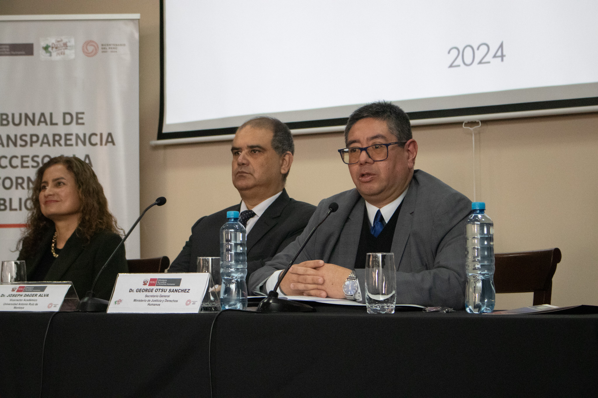 El evento contó con la participación de George Otsu, secretario general del MINJUSDH; Vanessa Luyo, presidenta del Tribunal de Transparencia y Acceso a la Información Pública del MINJUSDH; Roberto Burneo, juez supremo titular del Poder Judicial del Perú; Néstor Loyola, docente de la Carrera de Derecho UARM; y Eduardo Vega Luna, decano de la Facultad de Ciencias Sociales.