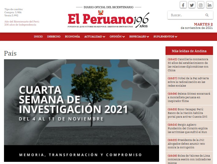 Nota informativa publicada en el Diario Oficial El Peruano el 29/10/2021