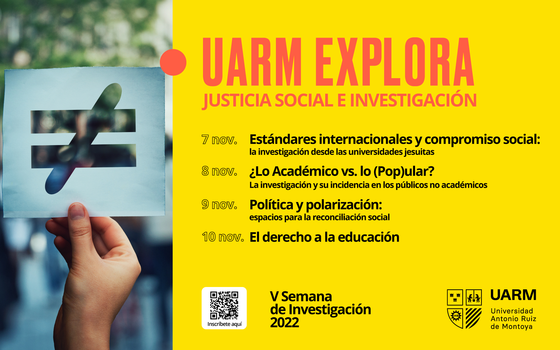 Del 7 al 11 de noviembre, la Universidad Antonio Ruiz de Montoya (UARM) presenta la V Semana de investigación, denominada UARM Explora “Justicia social e investigación”. Además de las mesas grupales de exposición, en esta edición, a través de las redes sociales institucionales se compartirán infografías elaboradas por los grupos de investigación en las que abordarán temas de importante actualidad como: Migración y desarrollo, la escritura como crítica social, aprendizajes y actores, ecología integral, instituciones y procesos políticos, abuso y violencia, y cultura, medios y poder.