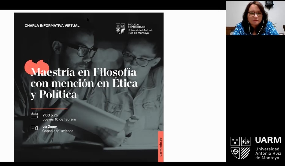 La Escuela de Posgrado de la Universidad Antonio Ruiz de Montoya (UARM) realizó la Charla informativa de la Maestría en Filosofía con mención en ética y política a cargo de la Dra. Rosa Elvira Vargas, coordinadora del programa.