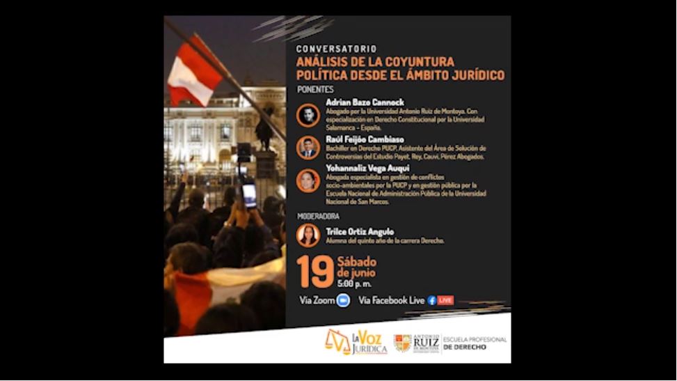 El equipo de La Voz Jurídica organizó el conversatorio: Análisis de la coyuntura política desde el ámbito jurídico, realizado el 19 de junio, en el cual participaron: Adrián Bazo, abogado por la UARM; Raúl Feijóo, bachiller en Derecho PUCP y Yohannaliz Vega, abogada especialista en gestión de conflictos socioambientales.