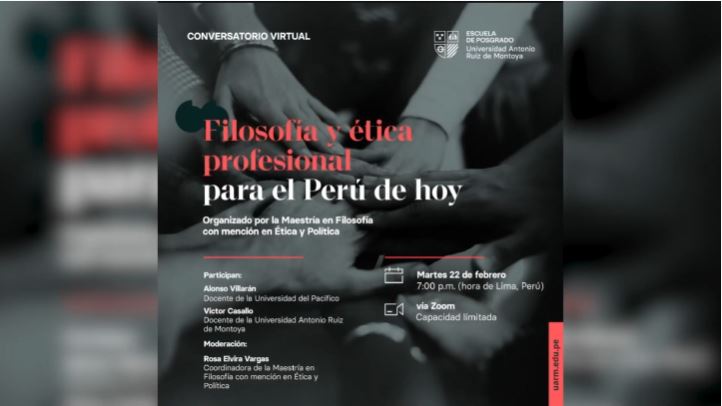 La Maestría en Filosofía con mención en Ética y Política de la Escuela de Posgrado de la UARM presentó el Conversatorio Virtual: Filosofía y ética profesional para el Perú de hoy, el 22 de febrero. En el evento participaron Alonso Villarán, docente de la Universidad del Pacífico; y Víctor Casallo, docente de la Universidad Antonio Ruiz de Montoya. Como Moderadora estuvo Rosa Elvira Vargas, Coordinadora de la maestría.