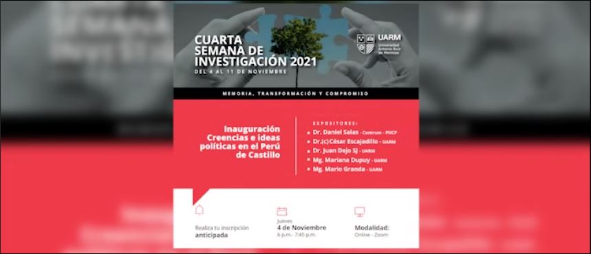 La Dirección General de Investigación de la Universidad Antonio Ruiz de Montoya realizó la Cuarta Semana de Investigación 2021, memoria, transformación y compromiso. En el primer día, 4 de noviembre, se presentó “Creencias e ideas políticas en el Perú de Castillo” en la que estuvieron como ponentes: Dr. Daniel Salas (Centrum – PUCP), Dr. (c) César Escajadillo (UARM), Dr. Juan Dejo SJ (UARM), Mg. Mariana Dupuy (UARM), Mg. Mario Granda (UARM)