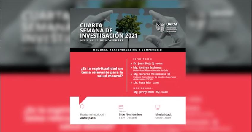 La Dirección General de Investigación de la Universidad Antonio Ruiz de Montoya realizó la Cuarta Semana de Investigación 2021, memoria, transformación y compromiso. En el tercer día, 8 de noviembre, se presentó “¿Es la espiritualidad un tema relevante para la salud mental?” en la que estuvieron como ponentes: Dr. Juan Dejo SJ (UARM), Mg. Andrea Espinoza (UAH-Chile), Mg. Gerardo Valenzuela SJ (ITESO) y Rosa Isla (UARM)