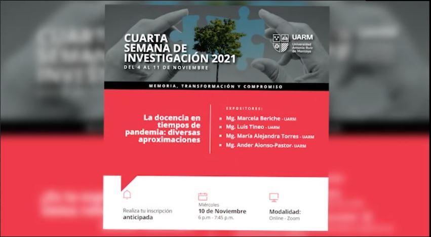 La Dirección General de Investigación de la Universidad Antonio Ruiz de Montoya realizó la Cuarta Semana de Investigación 2021, memoria, transformación y compromiso. En el quinto día, 10 de noviembre, se presentó “La docencia en tiempos de pandemia: diversas aproximaciones” en la que estuvieron como expositores: Mg. Marcela Beriche, Mg. Luis Tineo, Mg. María Alejandra Torres y Ander Alonso-Pastor.
