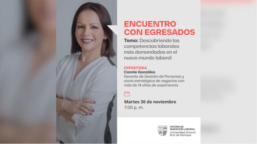 La Oficina de Inserción Laboral presentó el Encuentro con Egresados con el tema “Descubriendo las competencias laborales más demandadas en el nuevo mundo laboral”, realizado el 30 de noviembre. En el evento participó el Connie Gonzáles, gerente de Gestión de Personas y socia estratégica de negocios con más de 14 años de experiencia.