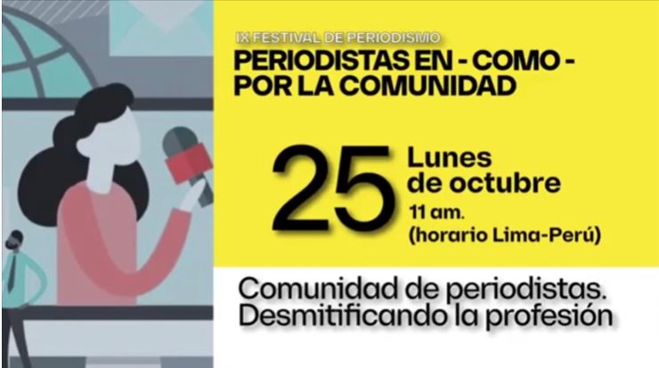 Alumnos de la carrera profesional de Periodismo presentaron el IX Festival de Periodismo "Periodistas en – como – por la comunidad – Mesa: Comunidad de periodistas. Desmitificando la profesión", realizado el 25 de octubre. En el evento participaron Alessandra Sotomayor, CEO de la escuela solidaria Allillanchu, Cuzco; Álvaro Fabián, editor de la revista Intercambio y Louis Fox Chung Canal, Editor y fundador de la editora Achachau. Moderó Kemal Ferri.