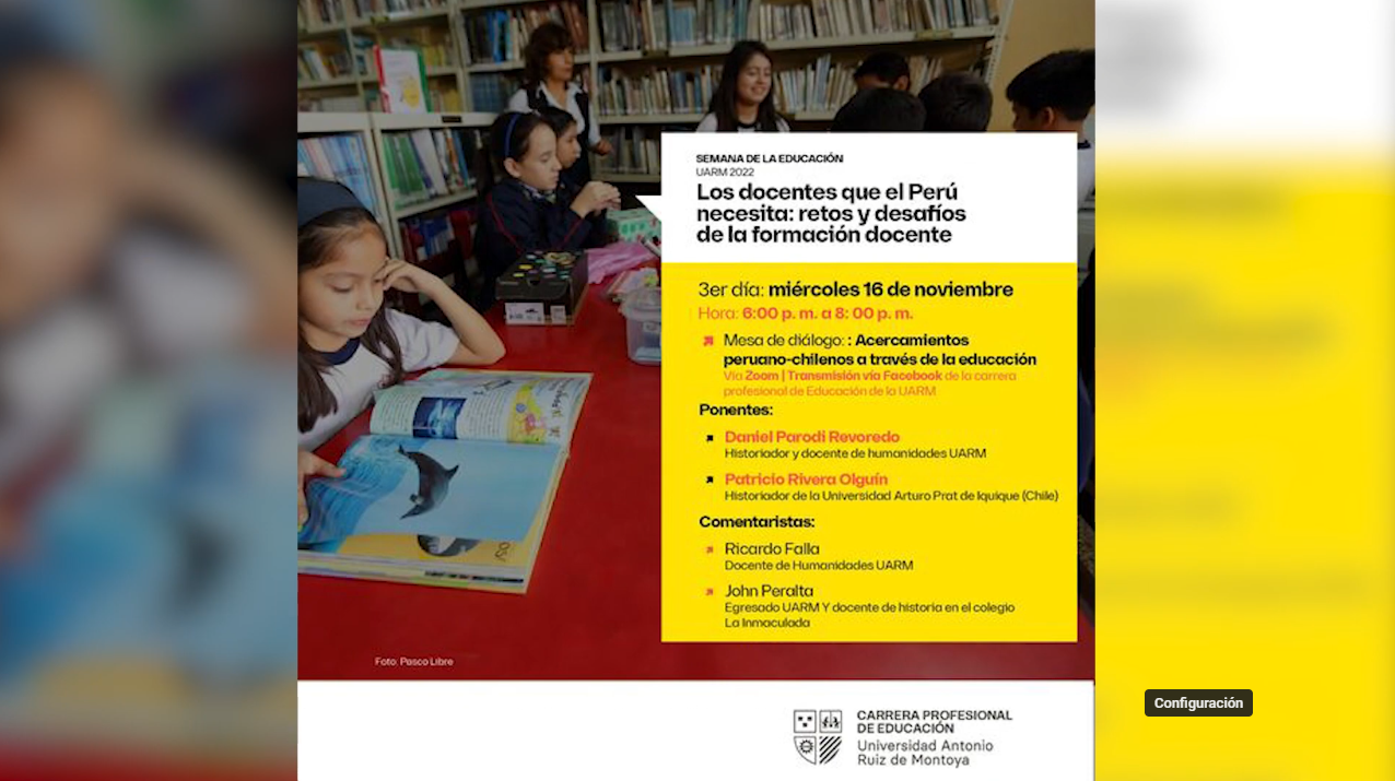 La carrera profesional de Educación de la Universidad Antonio Ruiz de Montoya, en el marco de la Semana de la Educación 2022, realizó la Mesa de diálogo: Acercamientos peruano-chilenos a través de la educación el 16 de noviembre. El evento contó con la participación de Daniel Parodi Revoredo, historiador y docente de humanidades en la UARM; Patricio Rivera Olguín, historiador de la Universidad Arturo Prat de Iquique (Chile); y con los comentarios de Ricardo Falla, docente de Humanidades en la UARM; y de John Peralta, egresado UARM y docente de historia en el colegio La Inmaculada.